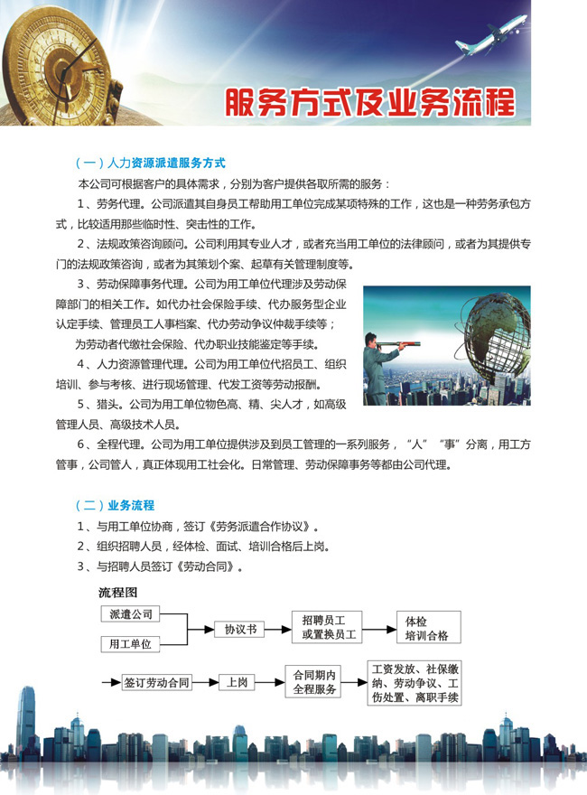 1、為用工單位招聘員工并提供崗前培訓服務。